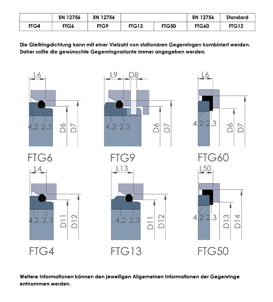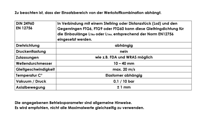 Zur Anpassung des Einsatzbereiches können Gleitring- und Elastomermaterialien der Tabelle „Allgemeine Werkstoffdaten“ entnommen werden. Gerne beraten wir bei der Auswahl des richtigen Werkstoffes.