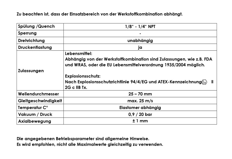 Zur Anpassung des Einsatzbereiches können Gleitring- und Elastomermaterialien der Tabelle „Allgemeine Werkstoffdaten“ entnommen werden. Gerne beraten wir bei der Auswahl des richtigen Werkstoffes.